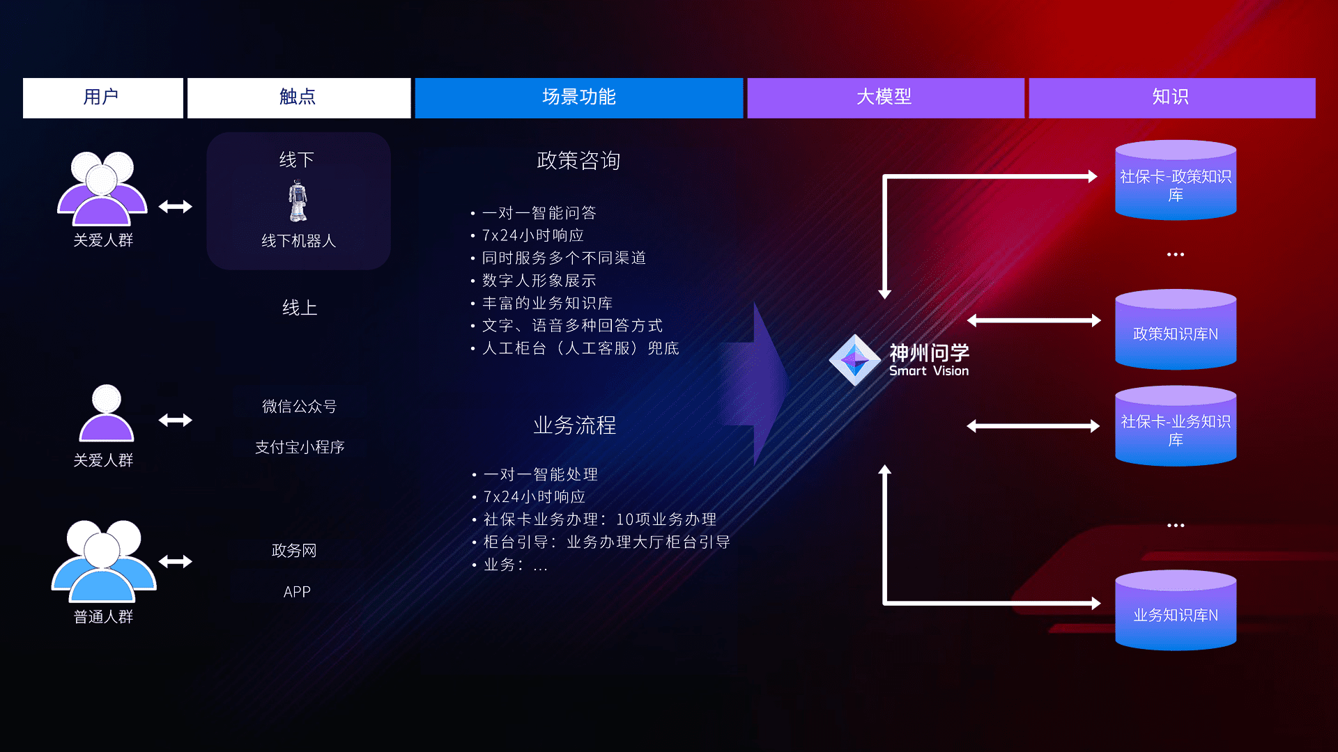 • 线上线下全覆盖:线上提供微信公众号、、、、支付宝小程序、、政务网、、app多种渠道,,,与线下机器人形成完整服务体系。。。